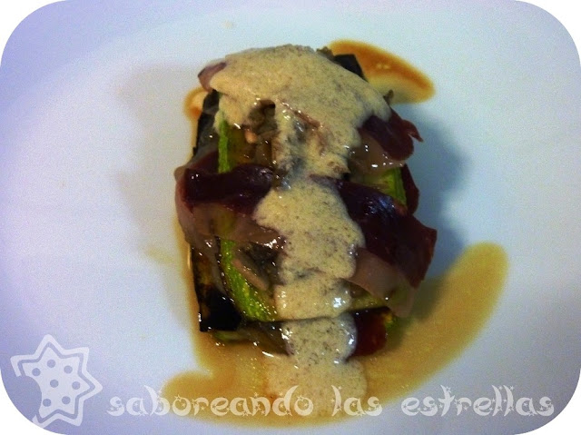 Ponemos una base de calabacín, una capa de cebolla caramelizada, dos lonchas de jamón de pato, calabacín, las setas, dos lonchas de jamón de pato y una cucharada de salsa por encima.