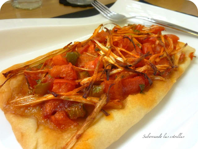 Tostamos media mini chapata por comensal y le repartimos la cebolla que hemos frito, cuando estén los pinchitos a nuestro gusto los presentamos sobre la tostada.