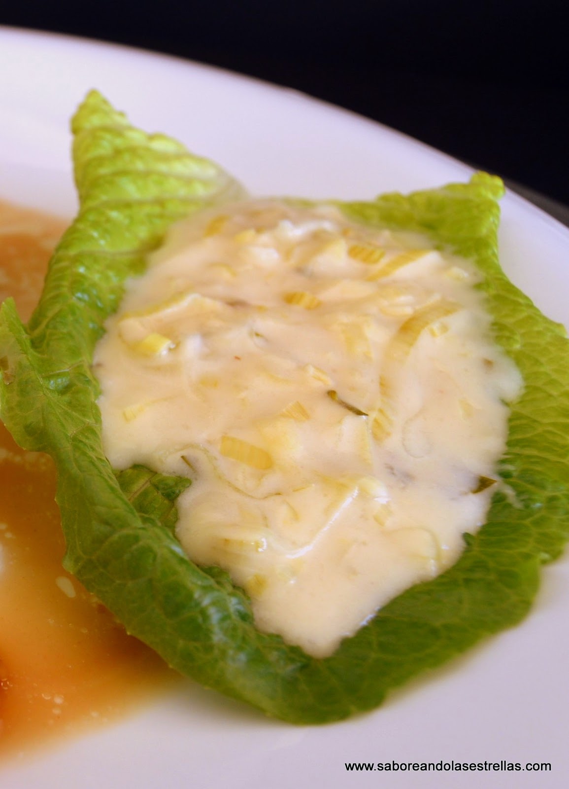 Empezaremos preparando la crema de estragón. Cortaremos en laminas finas el puerro después de haberlo limpiado y lo rehogaremos en una sartén con los 15 g de mantequilla unos cinco minutos. Salpimentamos.
