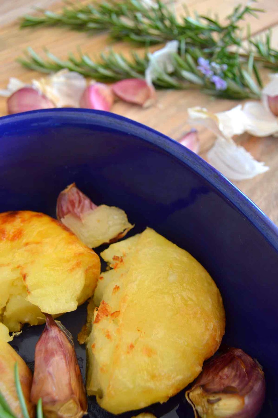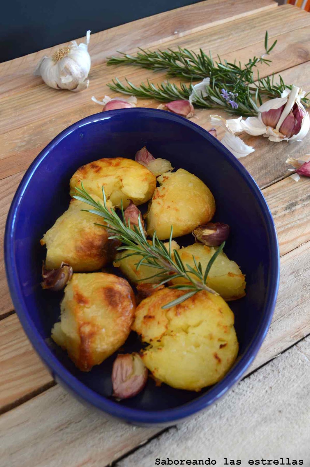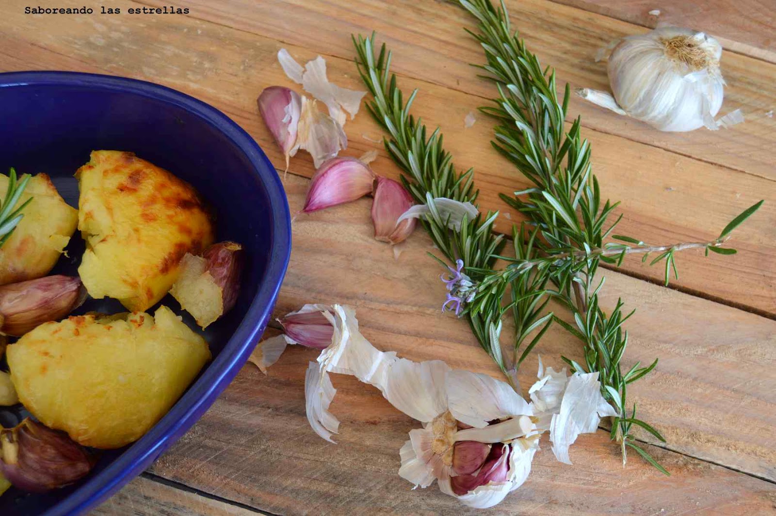 En lo referente al vídeo este viaje si que he llorado para editarlo porque me habían desaparecido las dos ultimas partes en las que se ve como le doy la vuelta a las patatas, añado los dientes de ajo y el romero y vuelve al horno hasta que se doran.