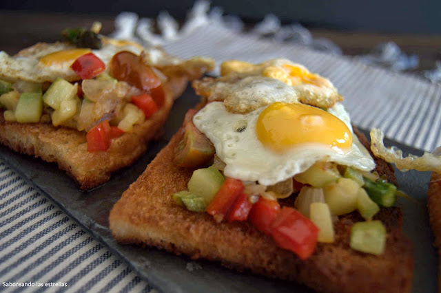 Estos montaditos, tostas o pinxos (no sabía que nombre darle) esta preparado algunas de las verduras que tenía en el frigorífico, si lo llego a preparar en jueves o viernes no se que le habría puesto al pan... jejejeje (en esta casa desaparece hasta el perejil).